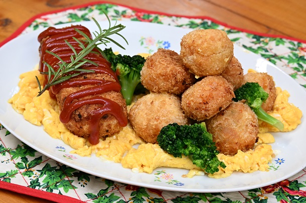 - 鍋に油を入れ、1に材料Bを米粉、溶き卵、パン粉の順につけ、きつね色になるまで揚げる。