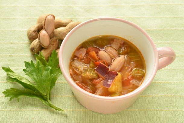 - 具材がしんなりしてきたら落花生とサツマイモを入れ、水、コンソメを加えて沸騰するまで強火で煮込む。
